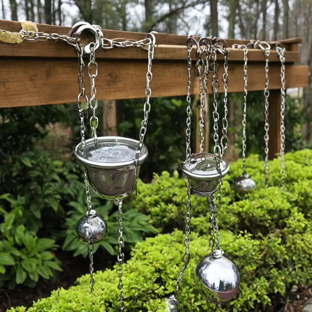 - Цепи с чашами — каждая чаша аккумулирует воду, создавая эффект «водопада». Особенно эффектно смотрятся на свету.