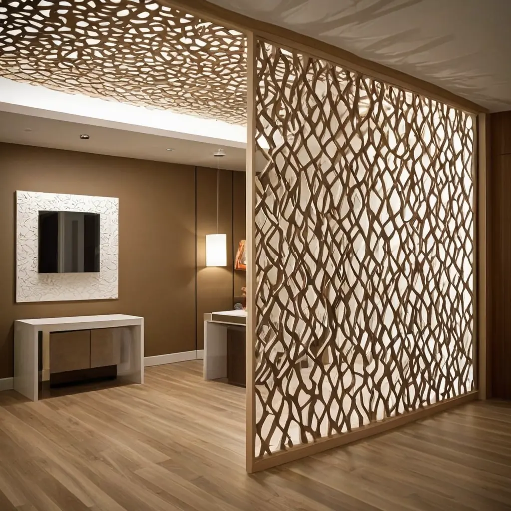 Особенно актуальна для деревянных и металлических перегородок. Резные панели создают игру светотени и придают интерьеру уют и индивидуальность.