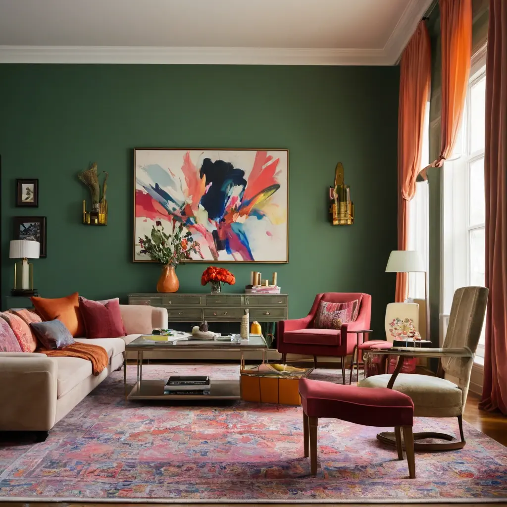 - Акцентные цвета — яркие пятна, привлекающие внимание, например, декоративные подушки или картины.